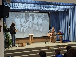 🎭 La Soffitta di Trento, il duo composto da Stefano (attore) ed Emanuele (musicista), ha emozionato i ragazzi con la loro performance di cantastorie. Attraverso fotografie antiche, poesia, dialetto e musica hanno fatto rivivere piazze e volti di una Trento di oltre un secolo fa, mostrando agli studenti l’importanza di riconoscere e scoprire la propria identità culturale.